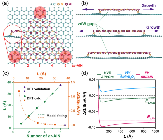 To unravel this mysterious growth mechanism, the research team, taking the growth of aluminum nitride (AlN) thin films on graphene as an example, utilized multi-scale theoretical calculations and continuous medium model derivations to systematically study the growth dynamics of AlN thin films in-plane (Fig. 2) and out-of-plane directions (Fig. 3). Interestingly, they found a new type of bonding at the interface between AlN and graphene, namely, the hybrid van der Waals interaction. This unique bonding mode allows the thin film growth to exhibit a new paradigm that is significantly different from traditional models, which is named the HVE (Hybrid van der Waals Epitaxy) model. Under the HVE model, the growth of materials in the plane and out of the plane is more strongly coupled together and satisfies certain physical constraints, which are also influenced by the interface interactions. To verify the reliability of this new growth model proposed by theory, Prof. Xuelin Yang from Peking University and others conducted experimental validation, preliminarily confirming the reliability of this growth mode (Fig. 4).