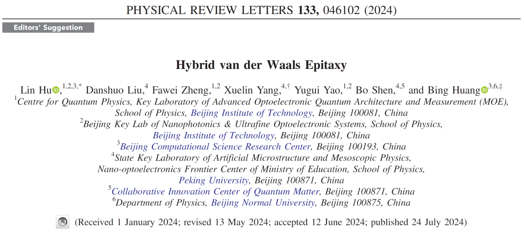 Lin Hu*, Danshuo Liu, Fawei Zheng, Xuelin Yang*, Yugui Yao, Bo Shen, and Bing Huang*. Hybrid van der Waals Epitaxy. Physical Review Letters, 133(4), 046102 (2024). (Editors’ Suggestion). (*the corresponding authors.)