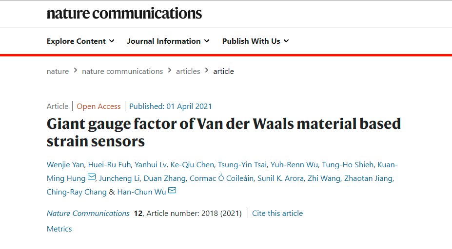 Wenjie Yan, Huei-Ru Fuh, Yanhui Lv, Ke-Qiu Chen, Tsung-Yin Tsai, Yuh-Renn Wu, Tung-Ho Shieh, Kuan-Ming Hung*, Juncheng Li, Duan Zhang, Cormac Ó Coileáin, Sunil K. Arora, Zhi Wang, Zhaotan Jiang, Ching-Ray Chang, and Han-Chun Wu*,“Giant Gauge factor of Van der Waals material based strain sensors”, Nature Communications 12, 2018 (2021).