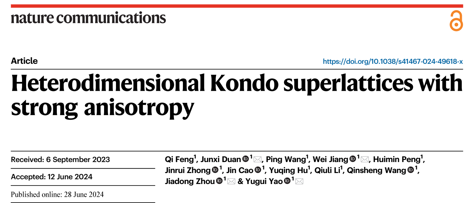 Qi Feng, Junxi Duan*, Ping Wang, Wei Jiang*, Huimin Peng, Jinrui Zhong, Jin Cao, Yuqing Hu, Qiuli Li, Qinsheng Wang, Jiadong Zhou* & Yugui Yao*, “Heterodimensional Kondo superlattices with strong anisotropy”, Nat Commun. 15, 5491 (2024) (*the corresponding authors)