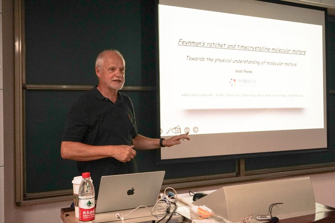At 2:00 p.m. on August 30, 2023, Antti Niemi, tenured professor of Nordic Center for Theoretical Physics and adjunct professor of Beijing Institute of Technology, gave an academic report entitled "Towards the physical understanding of molecular motors" for our faculty and students in Science Building B2-206.