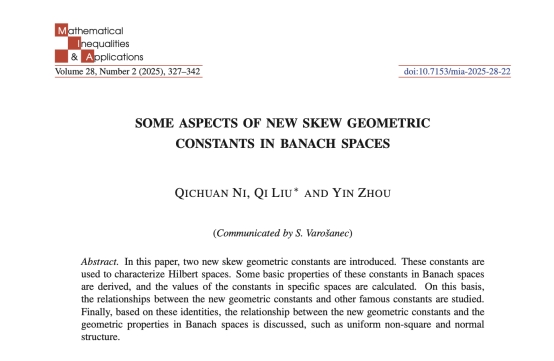 近日,太阳成集团tyc234cc2022级数学与应用数学专业本科生倪其川同学以第一作者撰写的论文《Some Aspects of new skew geometricconstants in Banach spaces》被SCI期刊《Mathematical Inequalities & Applications》接受发表。该期刊影响因子0.8,JCR二区,中科院四区。本研究依托太阳成集团tyc234cc微分方程教学科研团队,在论文撰写过程中得到团队诸多老师的悉心指导,这也是该同学以第一作者发表第二篇SCI学术论文,论文通讯作者为倪其川同学学业导师刘琪博士。