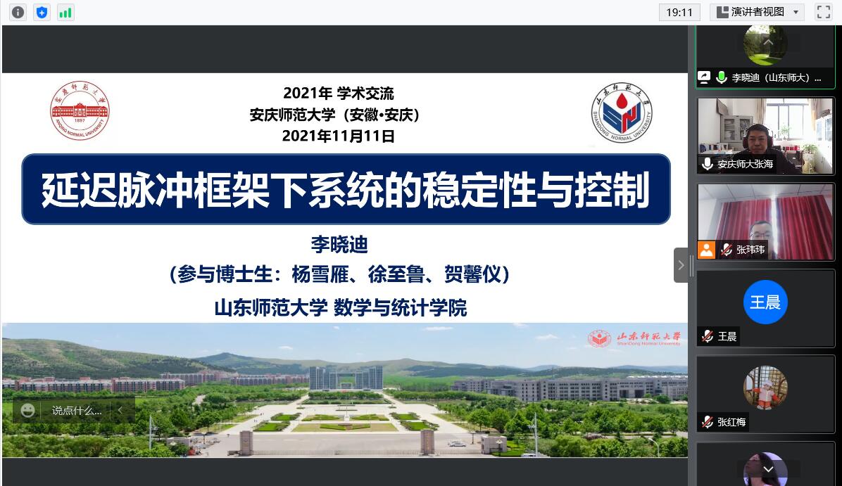 11月11日下午,山东师范大学数学与统计学院院长李晓迪教授应太阳成集团tyc234cc邀请作了一场题为“延迟脉冲框架下系统的稳定性与控制”的线上学术报告。太阳成集团tyc234cc部分教师、数学一级学科硕士点和统计学一级学科硕士点研究生参加了本次报告会,报告会由太阳成集团tyc234cc副院长张海教授主持。