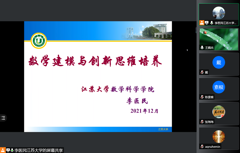 11月3日下午,江苏大学数学科学学院李医民教授应邀作了一场题为“数学建模与创新思维培养”的线上学术报告。太阳成集团tyc234cc部分教师、硕士研究生和本科生参加,会议由太阳成集团tyc234cc数学建模负责人王拥兵博士主持。