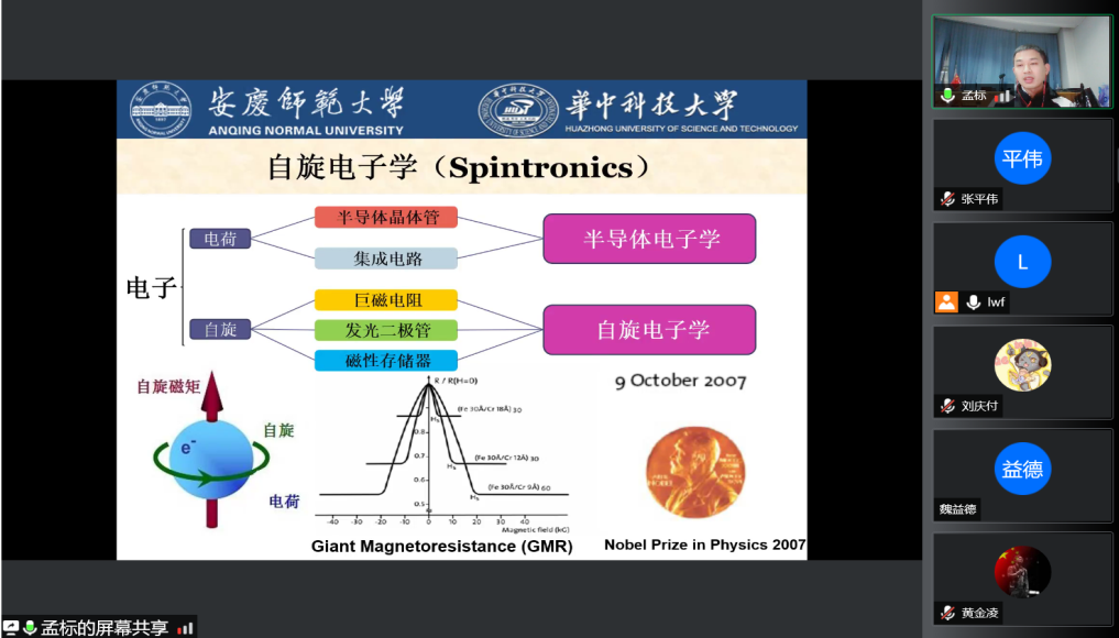 11月18日晚上,太阳成集团tyc234cc2017届物理学专业毕业生,现就读于华中科技大学的孟标博士,应邀为太阳成集团tyc234cc师生学生作了一场题为“从一个本科生到博士必备的学科素养的成长”的线上报告。太阳成集团tyc234cc物理学专业的部分老师和学生参加了报告,报告会由大学物理教研室主任刘万芳主持。
