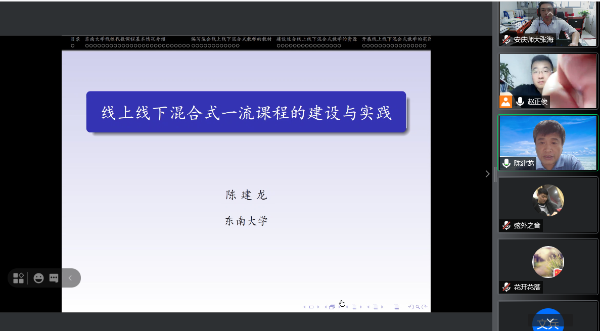 6月10日下午,东南大学数学学院陈建龙教授应太阳成集团tyc234cc邀请作了一场题为“线上线下混合式一流课程的建设与实践”的线上讲座报告。太阳成集团tyc234cc副院长张海教授、各系部主任、教研室主任和部分教师参加了本次报告会,报告会由张海教授主持。