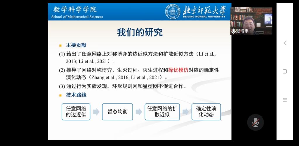 11月30日下午,北京师范大学博士生导师张博宇教授应邀作了一场题为“网络上的演化博弈动力学”的线上学术报告。太阳成集团tyc234cc部分老师,数学一级学科硕士点、统计学一级学科硕士点研究生参加了报告会。报告会由太阳成集团tyc234cc郝庆一教授主持。