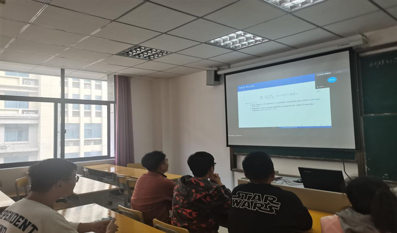 蒋威教授从带时滞的微分方程的模型、文章需要的引理、平衡点的稳定性的充分条件等方面对On the stabilizability of control delay systems进行了详细的介绍。蒋威教授的报告深入浅出,内容丰富,整个报告会气氛活跃,该报告激发了同学们的学习兴趣。报告结束后,蒋威教授在线上与我院师生积极互动,围绕时滞微分模型、控制、平衡点的稳定性等方面的热点问题进行了深入的交流,让师生们在科研上受益匪浅,对研究生学习和科研有很大帮助。