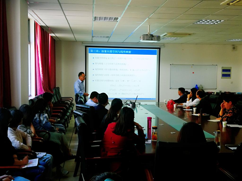 报告中,孙笑涛教授结合多年来的教学实践,向老师们分享了有关代数教学及课程建设的思考及体会,详细介绍了线性代数和抽象代数核心内容的教学方法,并给出了一些重要定理以及线性代数的具体应用。孙教授鼓励年青教师增强自身的教研意识,把科学研究和课堂教学结合起来,提高教学质量和教学效果。