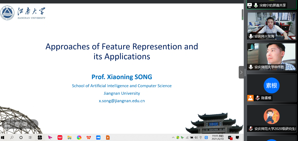 报告会上,宋晓宁教授就当前模式识别和计算机视觉研究领域内主流的表示学习、深度学习、量化学习以及领域知识共享等问题进行了阐述,介绍了多种模型的建模理论,刻画了非限制场景下的生物特征识别的准确性和实时性。宋晓宁教授与部分教师和研究生同学就模式识别和计算机视觉最新研究方法和热点问题进行了线上互动交流。