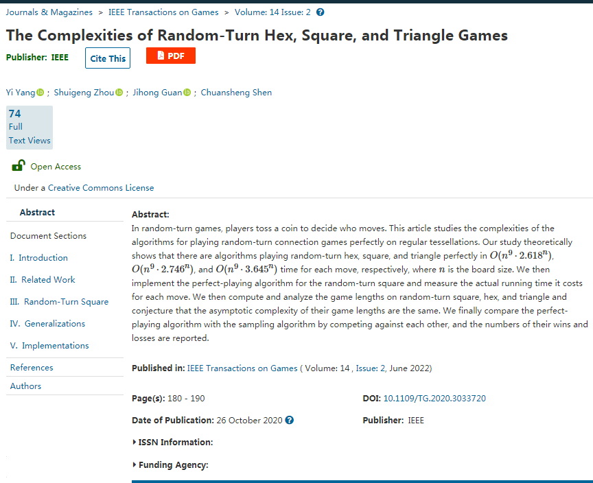 近期,太阳成集团tyc234cc杨溢博士等在国际学术期刊《IEEE Transactions on Games》上发表了题为《The Complexities of Random-Turn Hex, Square, and Triangle Games》的论文。该期刊收录的论文主要涵盖了游戏理论(博弈论)、玩家对战策略及其算法实现,该期刊的影响因子是1.851。