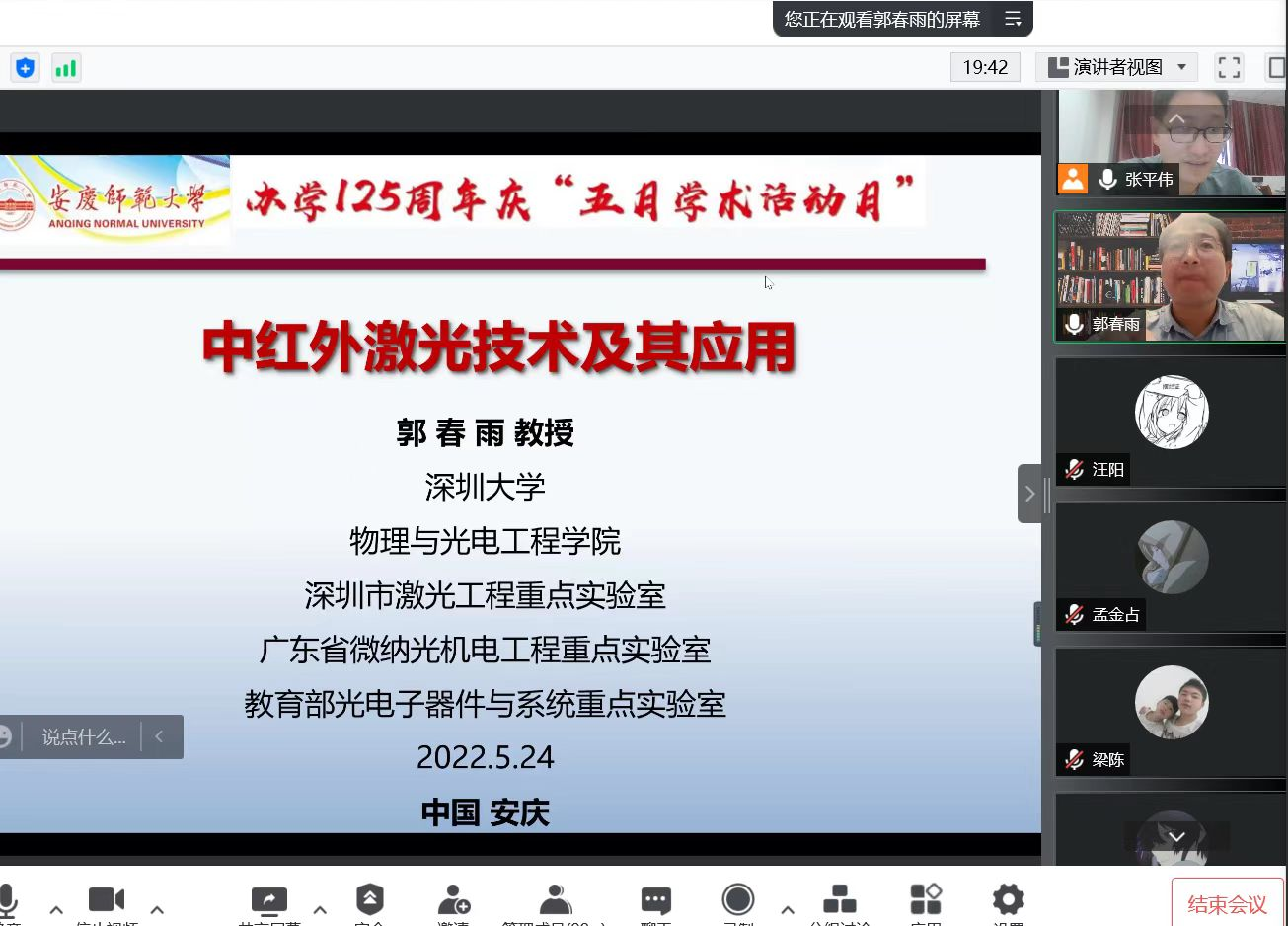 5月24日晚,深圳大学物理与光电工程学院郭春雨教授应太阳成集团tyc234cc邀请作了一场题为“中红外激光技术及其应用”的线上学术报告。太阳成集团tyc234cc、电子工程与智能制造学院部分教师、硕士研究生和本科生共计100余人聆听了报告,报告由物理系主任张平伟主持。