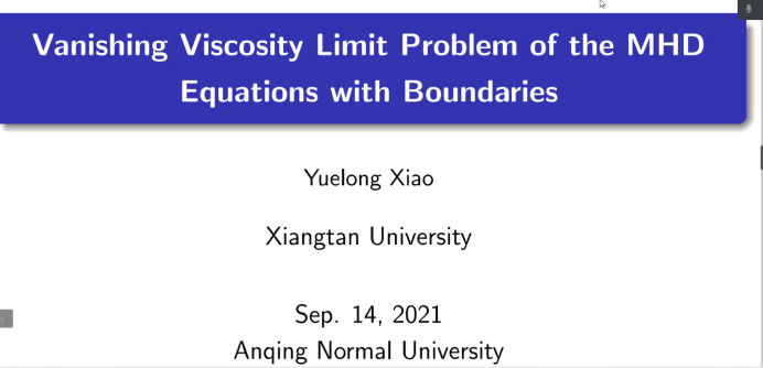 报告会上,肖跃龙教授围绕不可压流体力学的前沿课题展开阐述介绍了三维MHD方程组在粘性消失极限方面的最新成果。肖教授首先对Navier-Stokes方程的无粘极限问题进行了简要概述,然后对此类问题已有的成果和存在的困难进行了分析。肖跃龙教授特别指出了,对于无粘性极限问题最重要的是找到合适并且合理的边界条件。 最后,肖教授重点介绍了他最近的一个关于三维不可压MHD方程当边值满足一定条件时,在平坦区间上解具有一致收敛性的结果。肖跃龙教授报告结束后还与部分教师和研究生同学就流体力学方程的相关数学问题进行了线上互动交流。