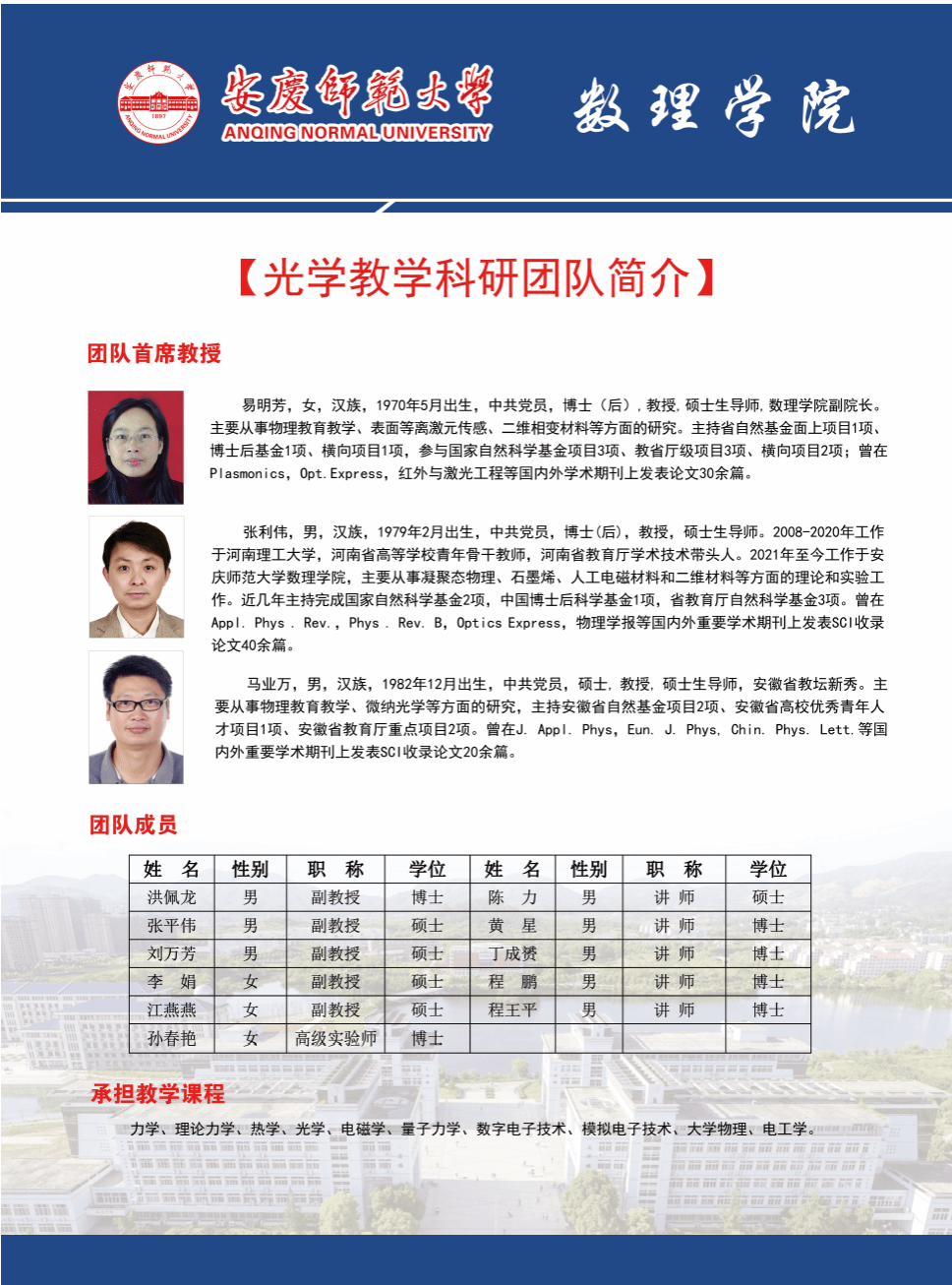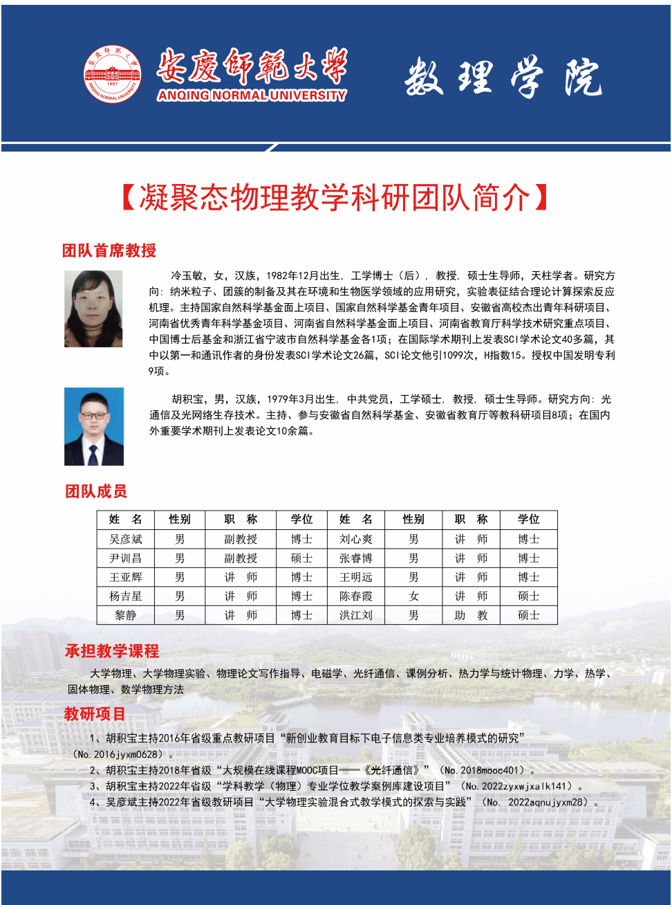 为有效整合太阳成集团tyc234cc教学、科研与社会服务力量,形成特色鲜明、持续稳定的学科专业发展方向,提升学院整体教科研水平与社会服务能力,更好地助推学院实现高质量发展,组建编码图论、微分方程、复杂系统、天文与天体物理、凝聚态物理、光学、信息计算和概率统计8个教学科研团队如下: