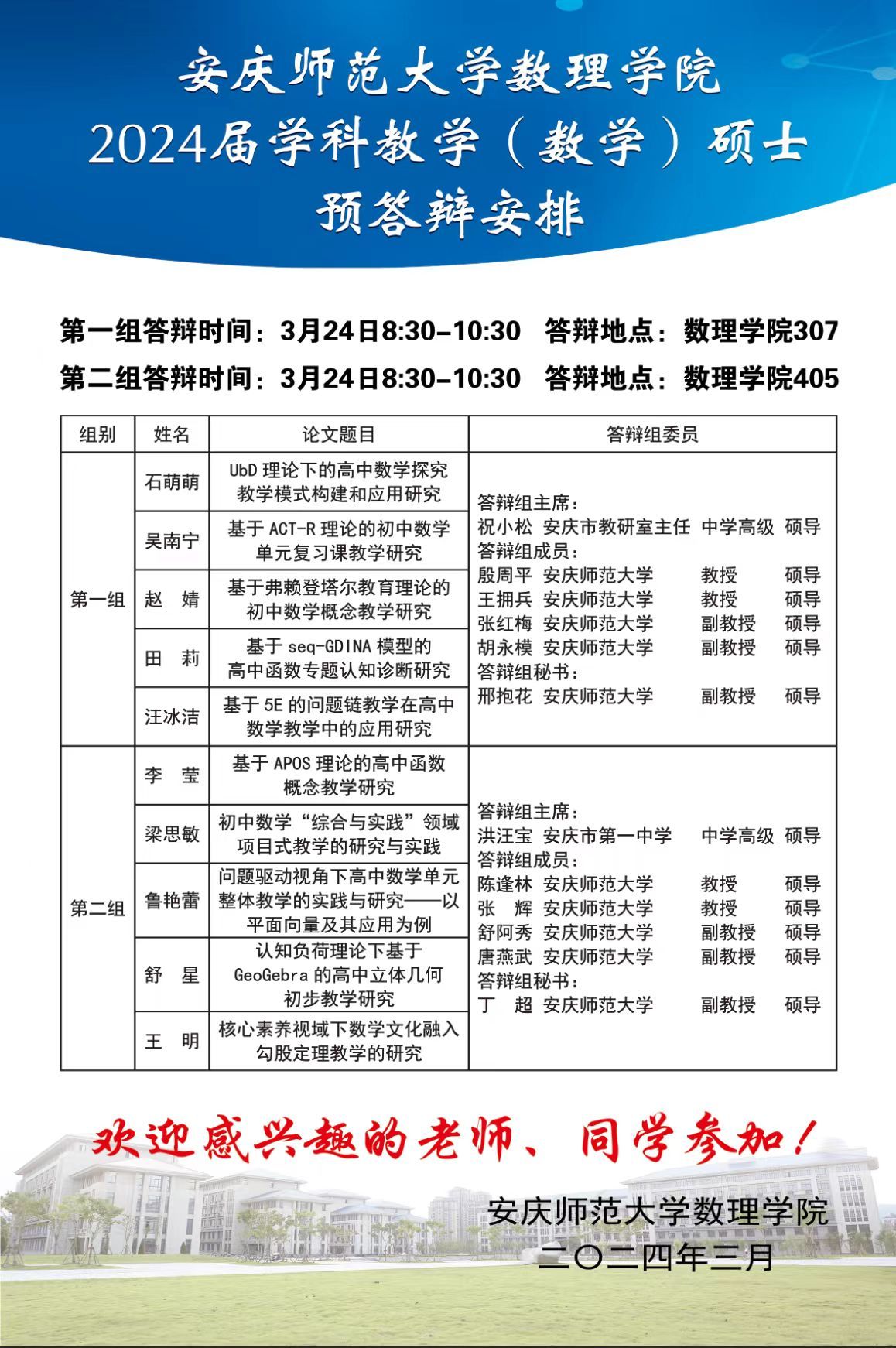 太阳成集团tyc234cc2024届学科教学(数学)硕士研究生预答辩安排