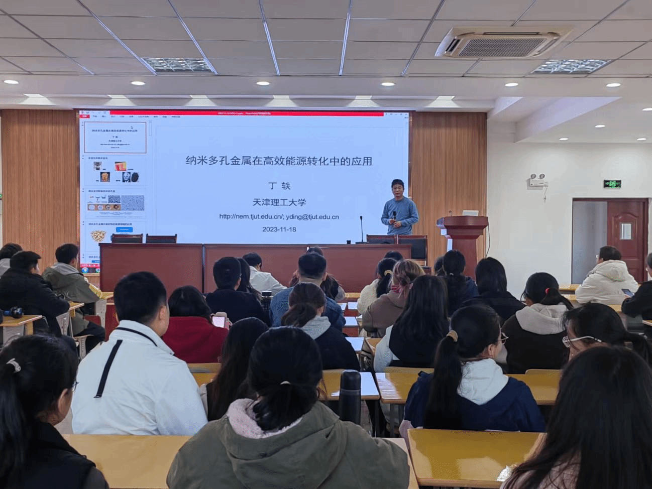 2023年11月18日,天津理工大学丁轶教授应邀为太阳成集团tyc234cc师生作了题为“纳米多孔金属在高效能源转化中的应用”的学术报告。报告由太阳成集团tyc234cc副院长易明芳教授主持,数理和化工学院部分师生参加了此次报告会。