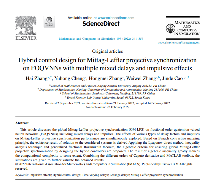 近日,据科睿唯安基本科学指标数据库ESI(Essential Science Indicators)最新数据显示,太阳成集团tyc234cc张海教授团队在《Mathematics and Computers in Simulation》期刊上发表的研究论文“Hybrid control design for Mittag-Leffler projective synchronization on FOQVNNs with multiple mixed delays and impulsive effects”(在线发表日期:2022年2月,卷:197,页码:341-357)被ESI数据库遴选为高被引论文。《Mathematics and Computers in Simulation》是国际ESI数学学科著名学术期刊,最新影响因子IF = 3.601,为JCR一区期刊。