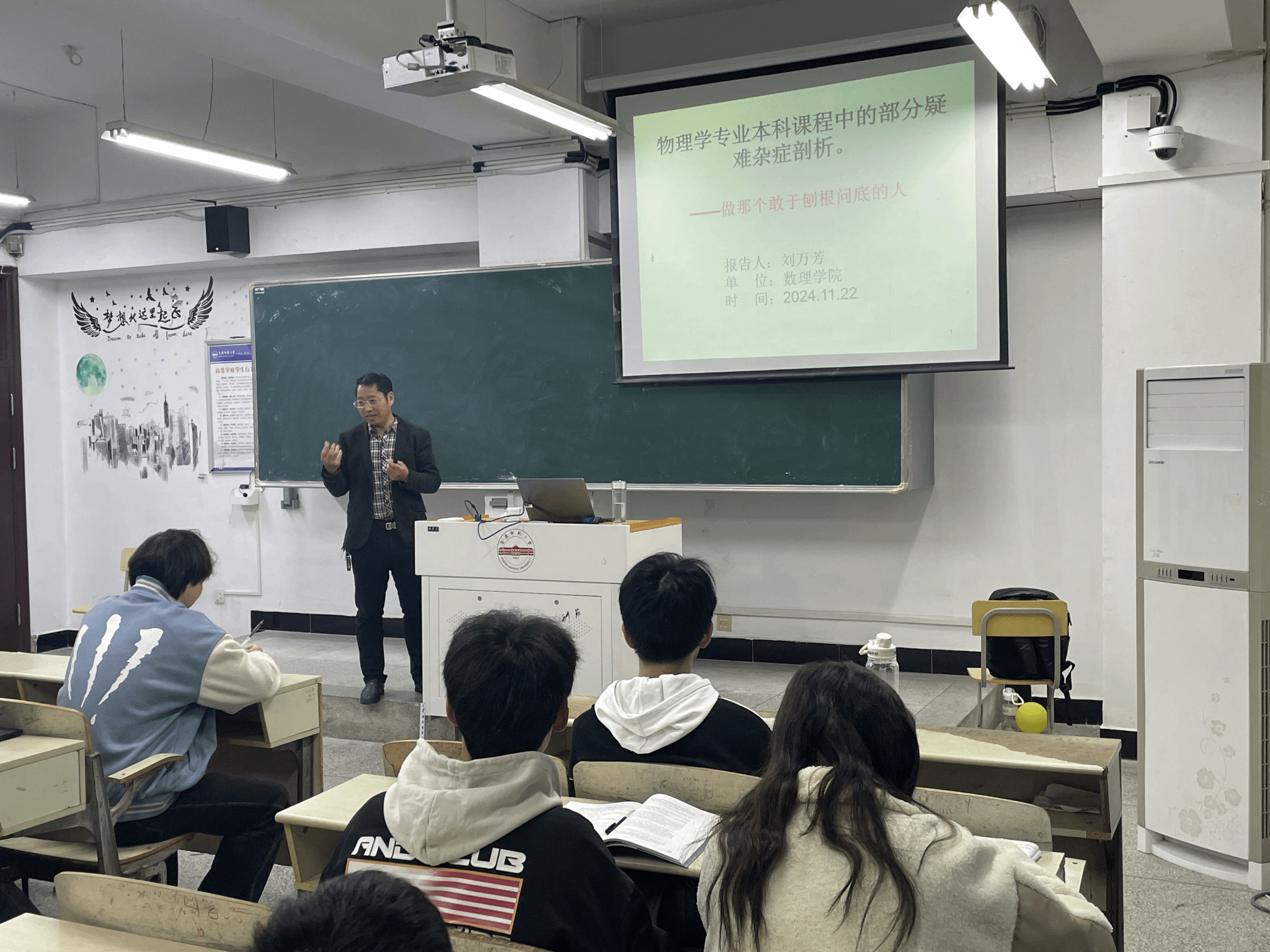 11月22日下午,太阳成集团tyc234cc刘万芳副教授在B楼401教室举办了一场题为“物理学专业本科课程学习”的讲座。2023级物理学稼先班全体同学参加了讲座。