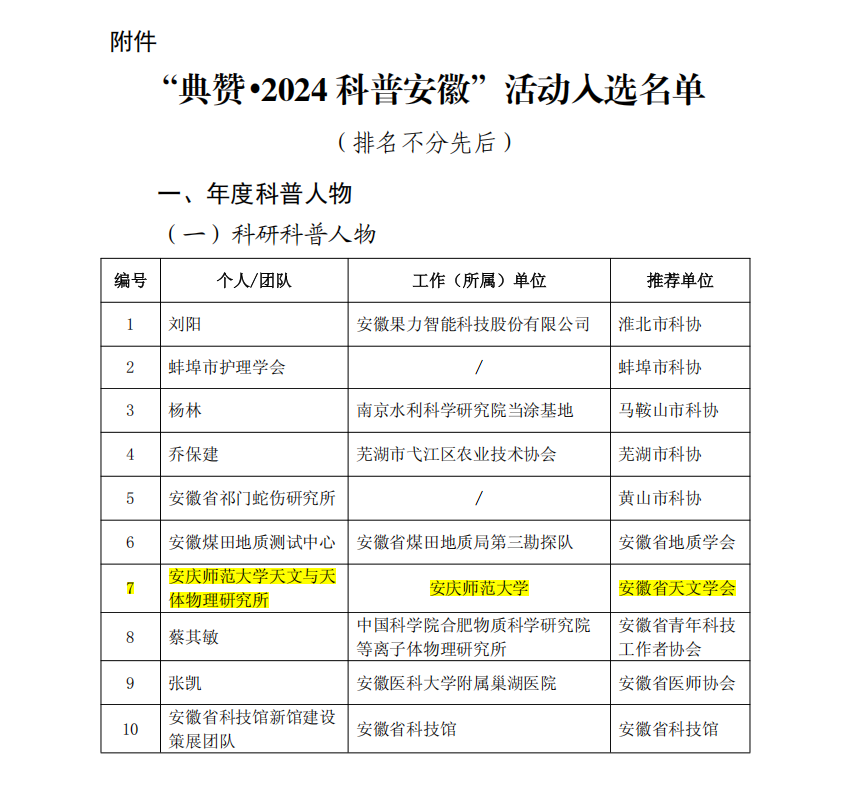太阳成集团tyc234cc天文与天体物理研究所团队荣获安徽省科协“典赞·2024科普安徽”年度科普人物