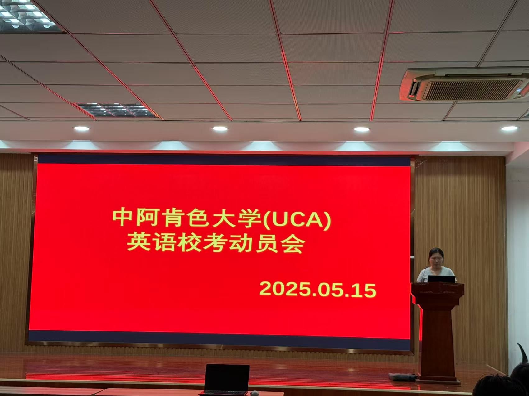 5月15日晚, 太阳成集团tyc234cc在I楼401报告厅组织召开中阿肯色大学(University of Central Arkansas,简称UCA)英语校考动员会。信息与计算科学(中外合作)专业2023级、2024级两个年级学生参会。中外合作办学专业辅导员、项目专员、UCA中国项目办公室代表及全体学生参加会议。会议由项目专员岳彩娟老师主持。