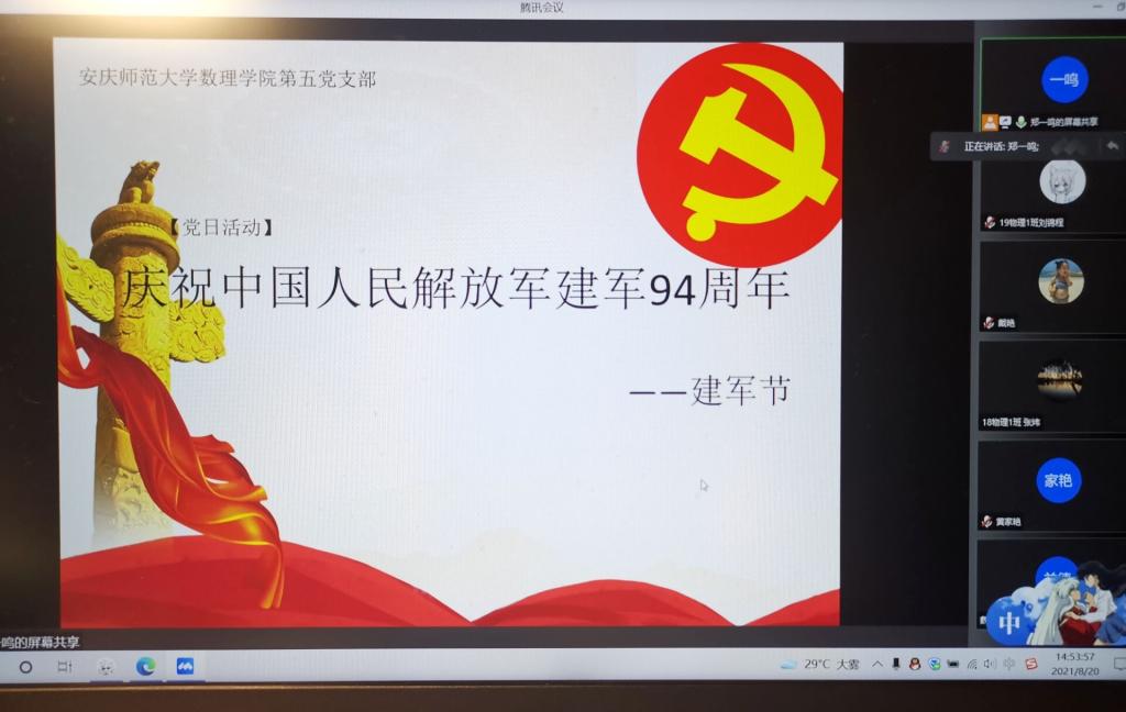 8月20日下午三点,太阳成集团tyc234cc学生第五党支部开展了线上主题党日活动,围绕“庆祝中国人民解放军建军94周年”的主题展开。此次活动由郑一鸣同志主持,支部正式党员、预备党员、发展对象、入党积极分子参加了此次活动。