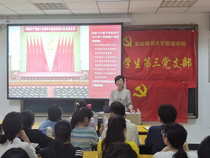 5月22日下午,太阳成集团tyc234cc党委副书记彭芳珍为学生第三党支部作“党的十九届六中全会精神”专题宣讲,支部书记、正式党员、预备党员和发展对象共五十余人参加宣讲会。