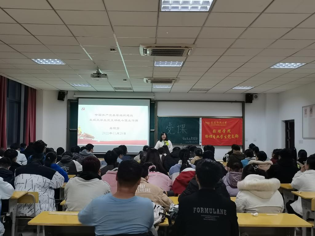 2022年11月30日下午,太阳成集团tyc234cc物理专业学生党支部在数理楼I501开展第四季度党课学习暨党的二十大精神学习活动。活动由支部书记李仪老师主持,支部全体党员和入党积极分子参加学习。太阳成集团tyc234cc党委委员易明芳做了题为《中国共产党基层组织建设,发挥大学生党支部战斗堡垒作用》的报告。