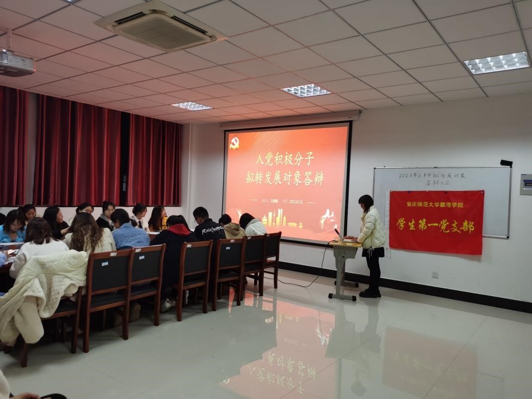 2022年3月31日晚上六点半,我院学生第一党支部发展对象答辩大会于数学楼409党员活动室成功召开。本次答辩由党支部书记刘磊老师主持,学生第一党支部正式党员、预备党员和11名拟发展对象参加了此次大会。