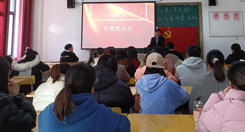 12月1日下午两点,太阳成集团tyc234cc学生第三党支部在数学楼202教室组织召开了增补拟发展对象答辩大会。本次答辩大会由黄岩松同志主持,支部书记黄兴强老师和支部正式党员、预备党员、拟发展对象参加了此次大会。