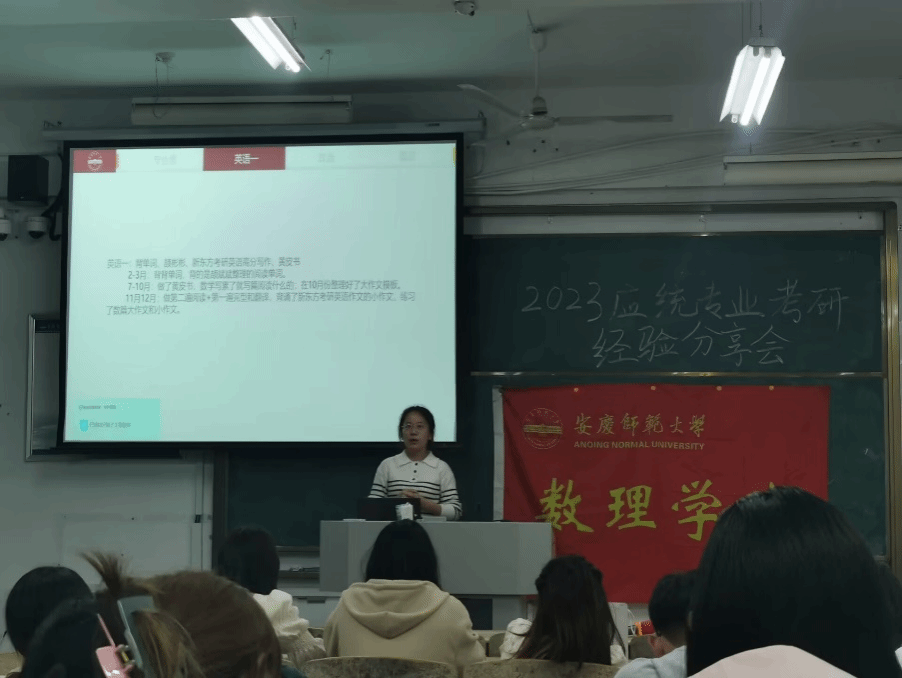 会上,应统的学长学姐介绍了当前的考研政策和报考趋势,分析了近几年的学院考研录取情况,并且从自身考研经历出发,围绕考研动机、择校经验、学习方法、资料准备、课程选择、时间安排、计划制定、细化目标、心态调整等方面向2024届同学们做了经验分享,提醒学弟学妹们一定要合理规划复习时间,持之以恒,脚踏实地,劳逸结合,科学备考。