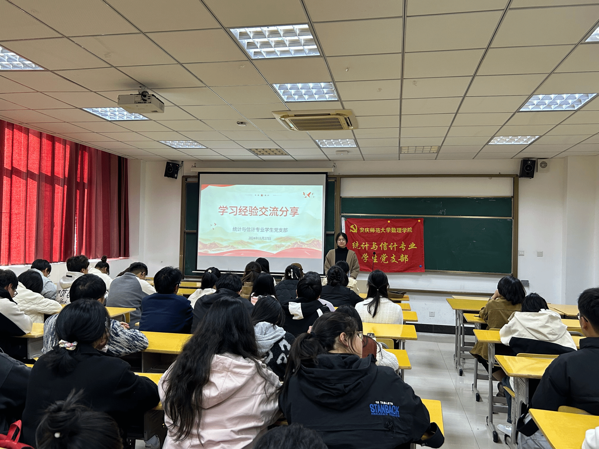 2024年11月27日下午,统计与信计专业学生党支部在数理楼501教室开展学习经验交流分享会,2023级、2024级应用统计学专业和信息与计算科学(中外合作)专业全体学生参加,会议由统计与信计专业学生党支部书记张娟主持。