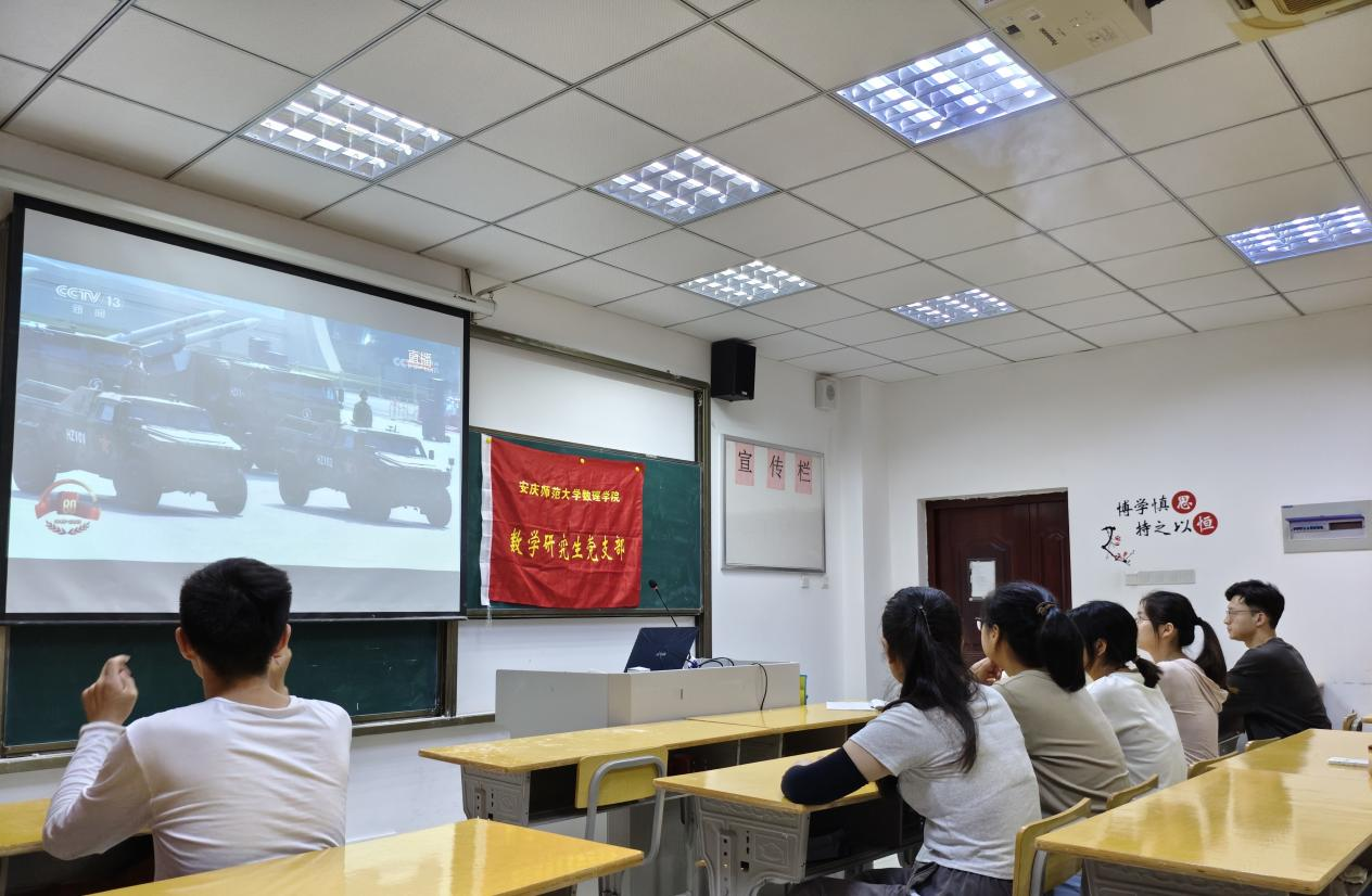 支部书记在总结中指出,本次集体观看既是一堂生动的爱国主义教育课,也是一次深刻的专业思想教育。希望全体研究生党员铭记历史、珍视和平,将观看阅兵激发出的爱国热情和专业认同,转化为潜心科研、刻苦学习的强大动力,积极投身于国家急需的基础研究和关键核心技术攻关,为实现中华民族伟大复兴的中国梦贡献数理人的智慧与力量。(撰稿:饶智勇,李薇薇;摄影:饶智勇 审核:彭芳珍)