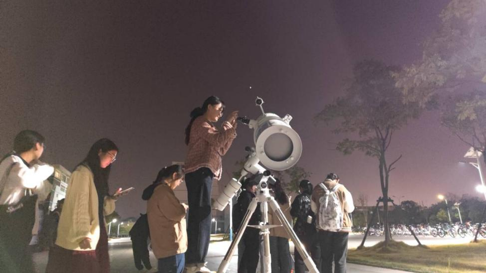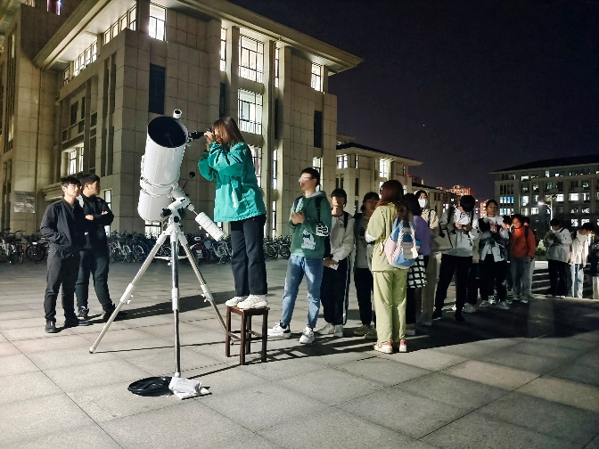 为提高学生科学文化水平,提升专业素养,10月11日晚,太阳成集团tyc234cc组织大学生天文爱好者协会于太阳成集团tyc234cc教学楼广场中央,开展“吟闲宇宙,伴行星辰”天文观测活动。太阳成集团tyc234cc2022级新生和天文爱好者协会成员通过天文望远镜“走向太空”,直观感受木星、土星、月球的全貌,领略宇宙的无穷魅力。