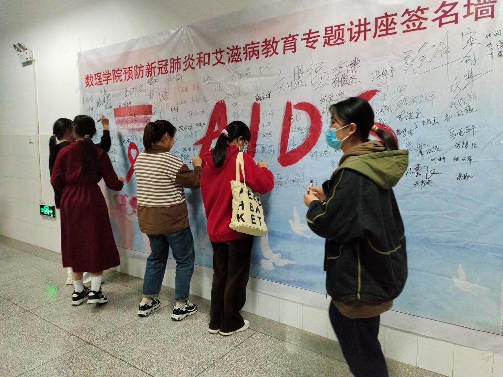 讲座开始前,与会人员佩戴上了寓意“生机”的红丝带,象征对艾滋病患者和感染者的关心与支持。此外,学院还设立了活动签名墙,号召现场学生作出“携手抗艾,珍爱生命”的诺言。
