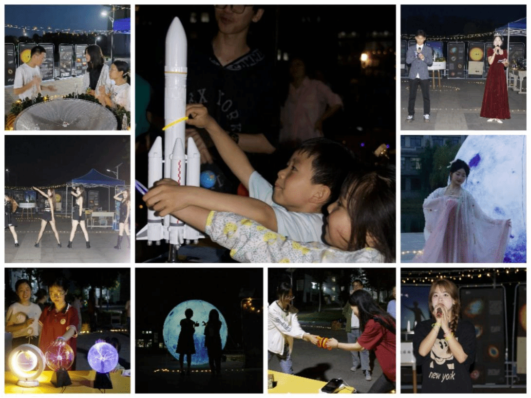 活动现场分为四个互动区域:模型展示区、天文观测区、趣味实验区和月球打卡区。参与者可以按顺序体验每个区域,或根据个人喜好自由探索。模型展示区展出了天球仪、长征五号火箭、祝融号火星车等精美模型及相关天文知识的海报,让同学们直观感受探索星辰宇宙的魅力。天文观测区通过望远镜揭示了遥远星空的神秘面纱,而物理实验区则通过单摆、烟雾瀑布和空气泡等实验,让同学们亲手实践科学原理。月球打卡区的直径3米的巨型充气月球灯成为了热门打卡点,同学们纷纷驻足打卡留念。