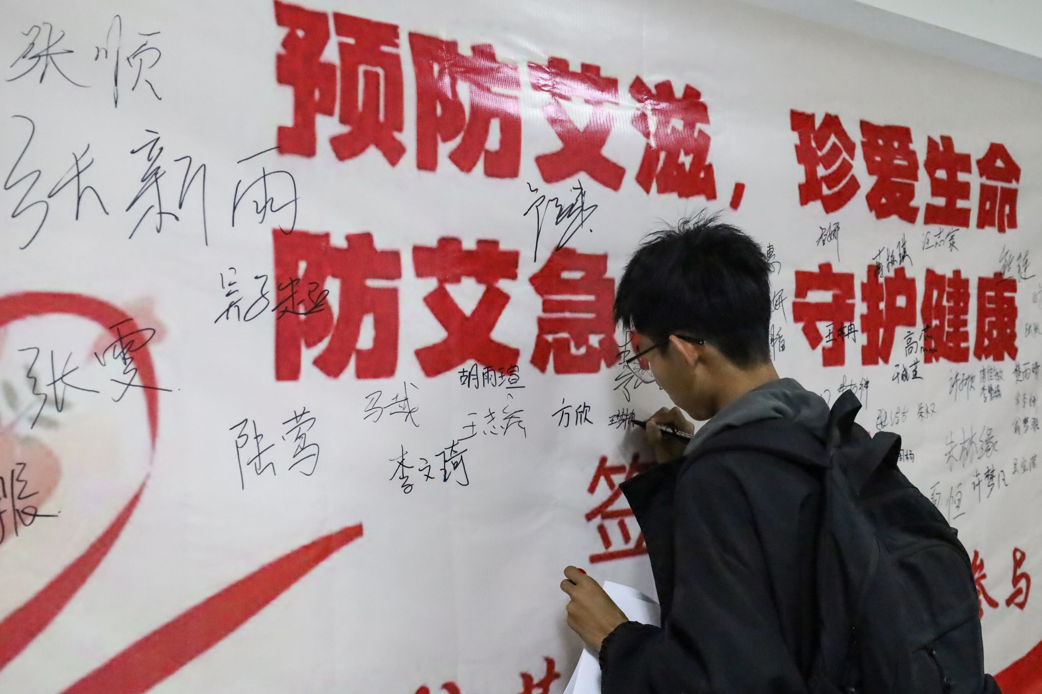 “通过宣传教育,可以提高学生对艾滋病防控工作的认识和支持,从而采取有效的预防措施,减少感染的风险。”数学与应用数学专业2024(4)班的何奕锦同学在签名墙上签下自己的名字并佩戴上代表“艾滋病防治”的红丝带。在他看来,大学是年轻人开始独立生活和探索人际关系的阶段,普及艾滋病知识可以帮助学生通过健康的生活方式预防疾病,这是新生们必不可少的一堂教育课。