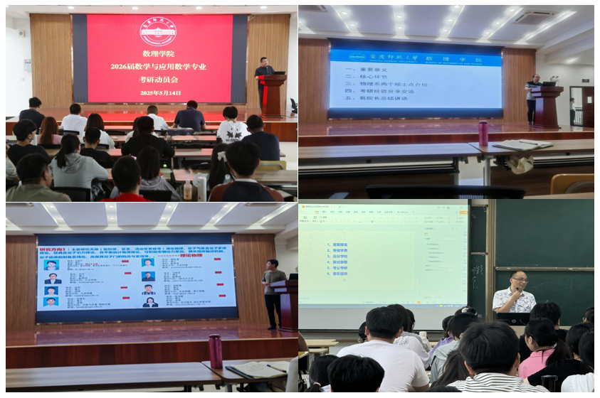 5月14日,太阳成集团tyc234cc数学与应用数学、物理学、信息与计算科学和应用统计学等四个专业分别召开2026届学生考研动员大会,太阳成集团tyc234cc院长张海,副院长易明芳,党委副书记彭芳珍,各系主任、专业骨干教师、2022级辅导员、2021级考研录取学生代表和2026届考研学生共500余人参加动员会。