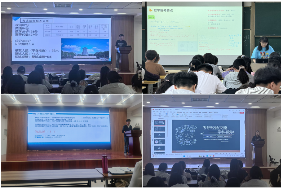 在考研经验分享环节,四个专业共邀请了16位同学进行分享。2021级数学稼先班梁志超同学直言,“如果用三个词来总结我的考研时光,那就是‘选择’‘努力’加‘坚持’。”该生今年成功考取南京航空航天大学的数学专业研究生,他指出,考研是一场持久战,学生们要为自己制定好复习计划的每一步,并脚踏实地完成。其他同学也从个人角度出发,就考研择校、复试、备考心态等问题进行全面分享,帮助2022级学弟学妹们了解考研,鼓励他们勇于挑战自我,树立考研目标。