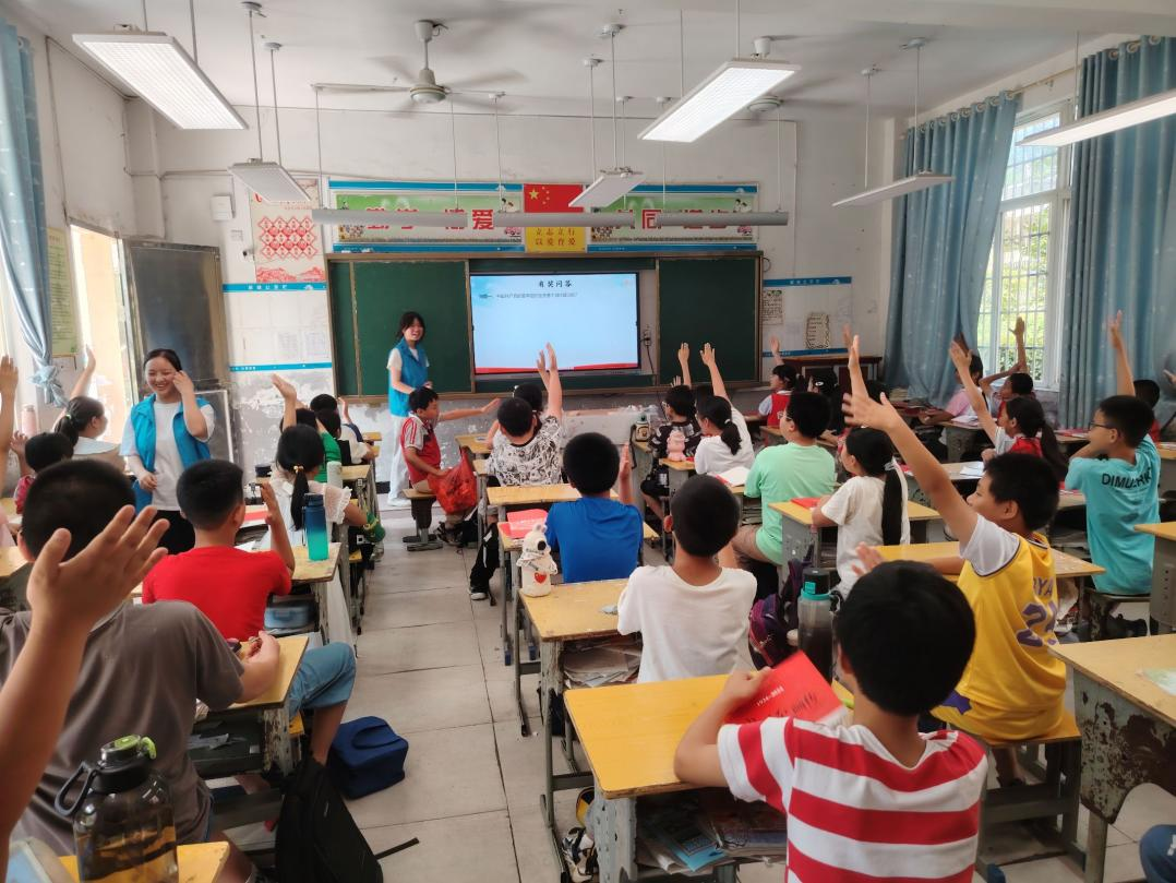 在授课过程中,队员们巧妙设计了“红色故事接龙”“党史知识小竞赛”等环节,学生们争相举手,积极抢答,现场气氛热烈非凡。每当有学生答对问题,便能获得精心准备的小书签、联名笔等奖励,这不仅激发了孩子们的学习热情,更让他们在活动中收获了知识与快乐。