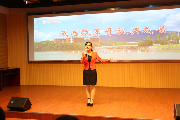 张敏老师以《春风化雨沐华夏 教育之花别样红》为演讲题目,以学校这些年发生的巨大变化为切入点,列举了学校在教学建设、科研工作等方面取得的巨大成就,表达了作为一名教育工作者的荣幸与自豪。声情并茂的演讲搭配上手势动作,她的精彩表现赢得了现场观众的阵阵掌声,充分展现了数学与计算科学学院教职工的精神面貌和风采。(数学与计算科学学院)
