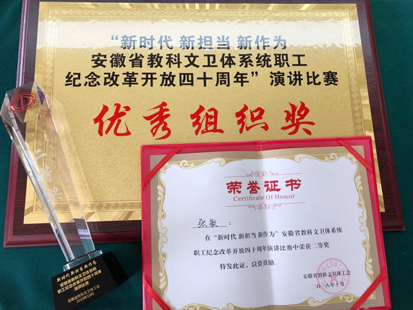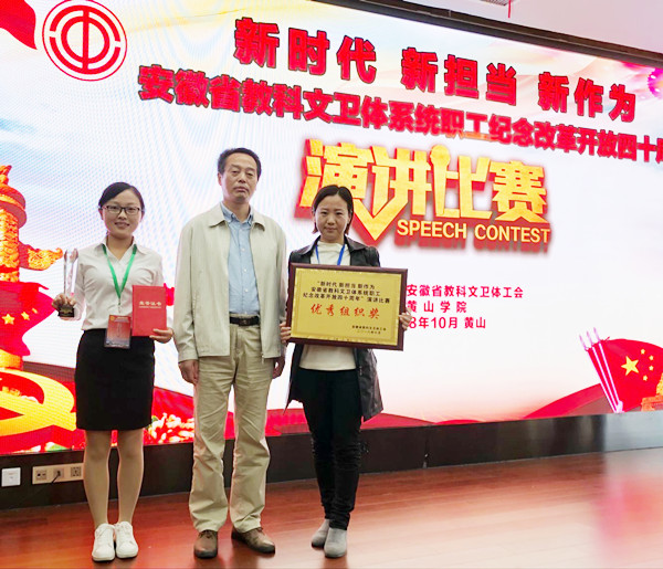 10月30日至31日,由安徽省教科文卫体工会主办的“新时代.新担当.新作为”安徽省教科文卫体系统职工纪念改革开放四十周年演讲比赛在黄山举办。我院张敏老师以“像渔民一样的教授”为题,说身边人身边事,演讲精神饱满,有吸引力、感染力强、营造了良好的演讲效果,荣获本次比赛二等奖,我校获得“优秀组织奖”。