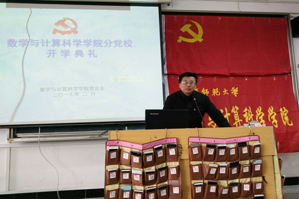 开班典礼在慷慨激昂的《国际歌》中正式拉开序幕,典礼共八项议程,依次进行。叶淼林书记首先对能够进入党校学习的79名学员表示热烈欢迎和衷心的祝贺。叶书记说:“党需要我们,我们也需要加入中国共产党”,他语重心长地告诫全体学员虽然同学们还不是共产党员,但仍要牢记“全心全意为人民服务”的宗旨。同时要安心学习党课知识,为早日成为一名优秀的共产党员打下坚实基础。叶书记对全体学员提出三点要求:一是希望每位学员都要遵守班规并要做到严格执行班规;二是要求把党课融入到“两学一做”活动当中来,认真学习《党章》、《党规》和系列讲话;三是处理好党课学习与日常学习的关系,合理安排并协调好手头的各项工作。最后叶书记预祝同学们党课取得好成绩。