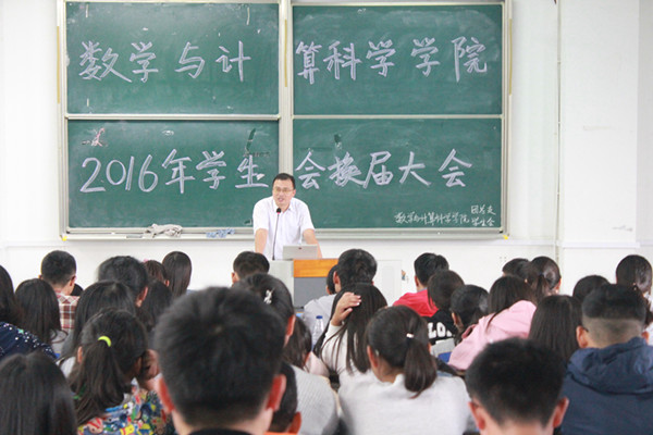 院团总支老师周的玲宣布了新一届学生会主席团部长名单,并预祝数学与计算科学学院学生会在新一届主席团部长的带领下能越来越好。上届学生会主席陈灵同学发言,她汇报了上一学年学生会的工作成果,总结了学生会发展和运行中存在的问题,并有针对性的提出了解决办法。新一届学生会主席吕鸿亮同学表示“我院学生会会继续在团总支的领导下,秉承奉献高效认真的工作态度,努力为学院师生服务好。”