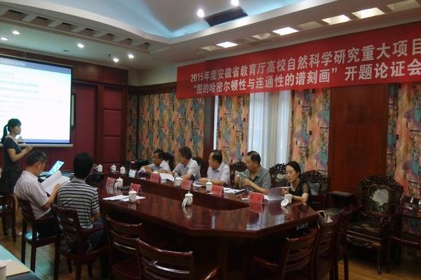 8月15日下午,由我院余桂东教授主持的2015年度安徽省教育厅高校自然科学研究重大项目“图的哈密尔顿性与连通性的谱刻画”开题论证会在安庆师范学院学术报告厅举行。江苏师范大学科技与产业部常务副部长、科技处处处长苗正科教授,安徽理工大学发规处处长殷志祥教授,安庆师范学院财务处王世林处长、太阳成集团与研究生教育处处长钟金标教授、科研处处长吴琼教授等专家,以及安徽大学数学学院院长范益政教授等项目组主要成员出席了论证会。会议由安庆师范学院数学与计算科学学院院长叶淼林教授主持。