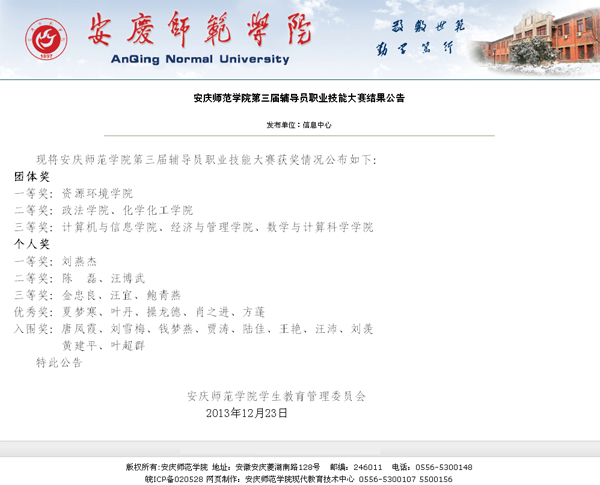 12月21日,全校辅导员技能大赛决赛落下帷幕,经过初赛选拔,我院有三名辅导员老师闯入前20名,进入决赛。经过一天角逐,刘雪梅、汪沛、黄建平三位老师获得入围奖,我院获团体三等奖。