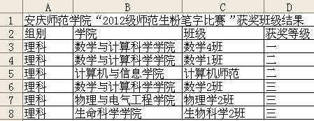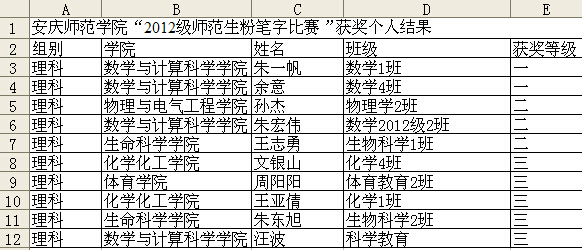 近日,由教务处主办的安庆师范学院“2012级师范生粉笔字比赛”结果已揭晓,数学与计算科学学院学生朱一帆、余意两位同学荣获理科组个人竞赛一等奖,朱宏伟荣获二等奖,汪波获三等将;数学4班荣获班级组一等奖,数学1班二等奖,数学2班三等奖,成为理科组获奖人数及班级最多的学院。