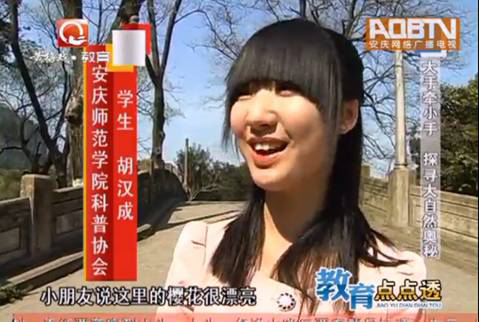 花开三月,绿染指头。日前,数学与计算科学学院大学生科普协会会员与安庆市石化三小学生在菱湖公园举办“大手牵小手,探寻自然奥秘”的科普活动。活动引起了媒体和广大市民的关注和赞誉。安庆网络广播电视“教育点点透”节目中专题予以报道。这是继今年一月份安庆网络广播电视“教育点点透”节目报道了我校大学生科普协会与石化三小举办的“科学放飞梦想”——制作太阳能车活动之后,“教育点点透”节目再次报道了我校学生走上社会、普及科学知识的新闻。