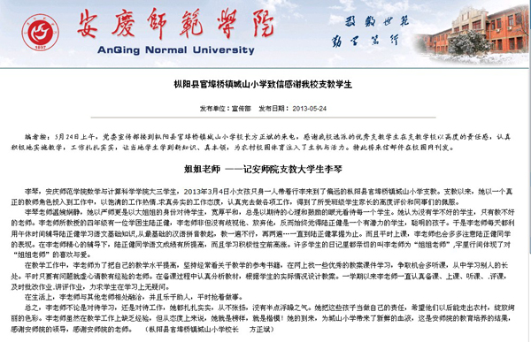 日前,我校党委宣传部接到枞阳县官埠桥镇城山小学校长方正斌的来电,感谢我院选派的优秀支教学生、10数1班李琴同学在支教学校以高度的责任感,认真积极地实施教学,工作扎扎实实,让当地学生学到新知识、真本领,为农村校园体育注入了生机与活力。党委宣传部特将此将来信邮件在校园网刊发。