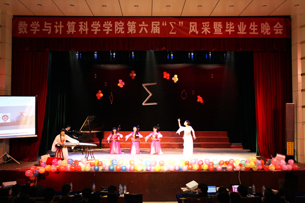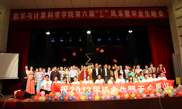 “∑”风采暨欢送毕业生文艺晚会作为数学与计算科学学院的学生品牌活动之一,旨在为毕业生们提供一个感恩母校、互道离别、讲述不舍深情的舞台。多年来晚会在沿袭传统的同时也在形式和内容上不断创新发展,成为了毕业时节广大师生共同期待的盛宴。今年,推出“师生同台,共话离别”的主题,让学院的祝福、老师的期许以及学生们的留恋编织成美好的寄托,祝愿学院2013届毕业生们满载着期冀与祝福起航,在新的人生旅程中乘风破浪、再创辉煌!(童慧 刘雪梅)