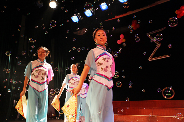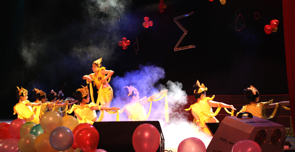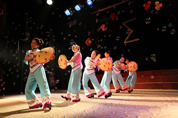 在一段大气磅礴的开场舞《飞天》后本场晚会正式拉开帷幕,晚会共分为“似锦年华、与君同”、“ 逐梦青春、与君别”、“ 渐行渐远、与君忆”三大篇章。在第一篇章“似锦年华、与君同”中,展现着大学生的青春与活力。原创歌曲《征程》伴着钢琴的演奏让众人如痴如醉,久久回味;阿兵《脱口秀》中一段惟妙惟肖的海绵宝宝的配音更让观众呐喊声与掌声迭起,甚是精彩;乐器合奏《美丽的神话》、舞蹈《青春的节拍》为我们献上了唯美与妩媚并存的拉丁,活力与激情四射的机械舞,美丽婀娜的蛇舞,震撼听觉,闪亮视角,都均给带来了一场听觉与视觉上的巨大享受。第二篇章“ 逐梦青春、与君别”讲述了大学生活中的亲情、友情、和师生情,正是陪君醉笑三千场,不诉离殇。话剧《抓狂英语》以诙谐幽默的形式演绎学习英语的历程,俏皮搞笑,让我们回忆起那段为四六级奋斗的历程;学院副院长胡万宝教授和毕业生梁慧同学倾情演唱《等你等了那么久》更显师生之谊;由舒阿秀等六位教师的民族舞《采茶》更是将晚会推向了高潮,全场同学们高呼老师的名字,用自己的方式表达临别对老师的不舍与喜爱,感人至深。第三篇章“ 渐行渐远、与君忆”追溯了已经过去的大学时光。那些年的《光辉岁月》,《我的大学四年》,《你最珍贵》,《我只在乎你》歌曲串烧,串起了多少回忆,同学们饱含激情,表达了对老师、父母的感谢,对同窗的依依惜别;舞蹈《青春纪念册》在欢快律动中表达出毕业生对于大学时光的依恋,触动了现场每一位观众感伤的内心。最后,全体学生会工作人员与全体演员合唱《明天会更好》将全场气氛推向高潮,党总支副书记计裕人带领全体辅导员老师也登上舞台,与同学们共同演唱,向2013届毕业生表达最诚挚的祝福。至此,本场晚会圆满落幕。